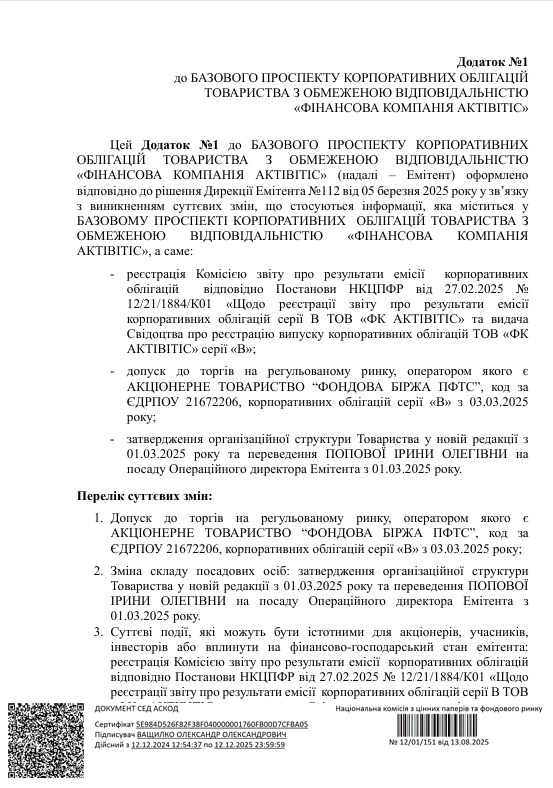 ПропозиціїПро компаніюМапа інвестораКабінет інвестораЗастосунок UNIVERДодаток №1 до базового проспекту корпоративних облігацій Товариства з обмеженою відповідальністю «Фінансова компанія Актівітіс» (Дата розміщення 14.08.2025)Завантажити документЗавантажити архів