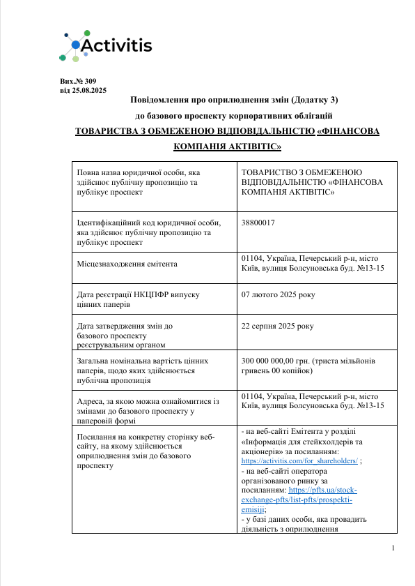 ПропозиціїПро компаніюМапа інвестораКабінет інвестораЗастосунок UNIVERПовідомлення про оприлюднення змін (Додатку 3) до базового проспекту корпоративних облігацій (Дата розміщення 26.08.2025)Завантажити документЗавантажити архів